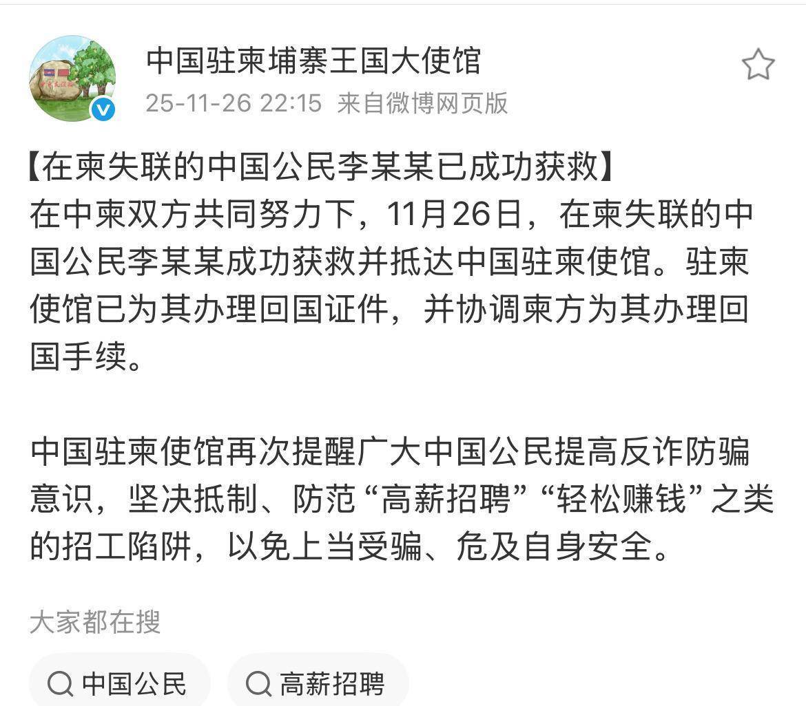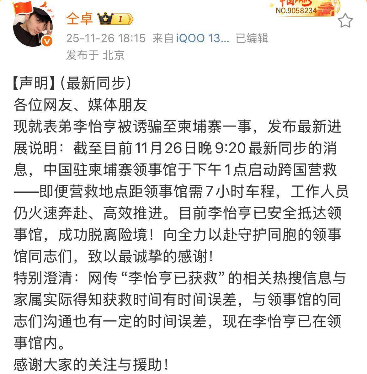 11月26日晚,李某某的表哥仝卓也在微博发声:各位网友、媒体朋友,现就表弟李怡亨被诱骗至柬埔寨一事,发布最新进展说明:截至目前11月26日晚9:20最新同步的消息,中国驻柬埔寨领事馆于下午1点启动跨国营救——即便营救地点距领事馆需7小时车程,工作人员仍火速奔赴、高效推进。目前李怡亨已安全抵达领事馆,成功脱离险境!向全力以赴守护同胞的领事馆同志们,致以最诚挚的感谢!